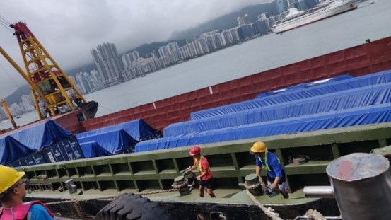 - Transport steel rebars by derrick barge with tug boat to Hong Kong mid-stream next to outboard mother vessel